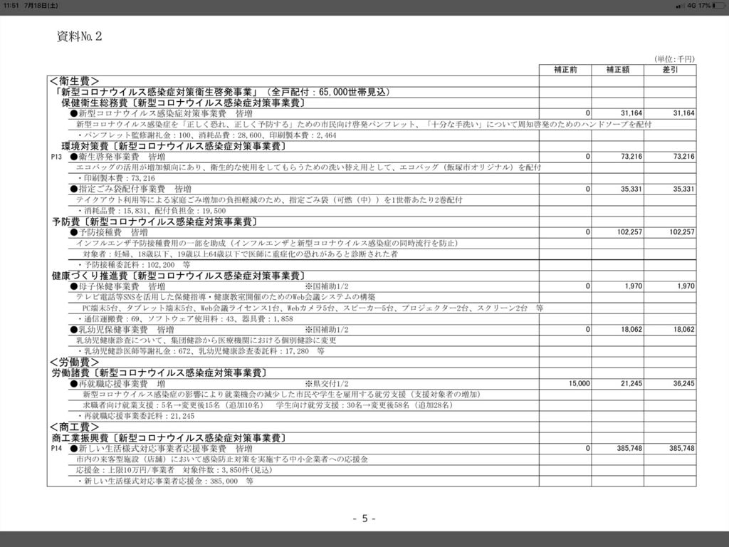私が特に気になっているのは、保健衛生総務費としてのハンドソープ、衛生啓発事業費としてのエコバッグ、指定ごみ袋配布事業費として可燃ごみ袋2巻を65,000世帯に1950万円を使って配布するというもの。人それぞれに使うハンドソープ、エコバッグは違う。可燃ごみ袋も大中小、家族形態やごみの量は違うので、中サイズが、1番利用が多いという理由だけで、決められていくのが、おかしい。