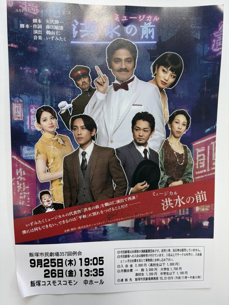 議会が終わって、花火大会にするか悩んだ末、飯塚市民劇場主催の『ミュージカル洪水の前』を観に行きました。終わりがかなり衝撃的でした。