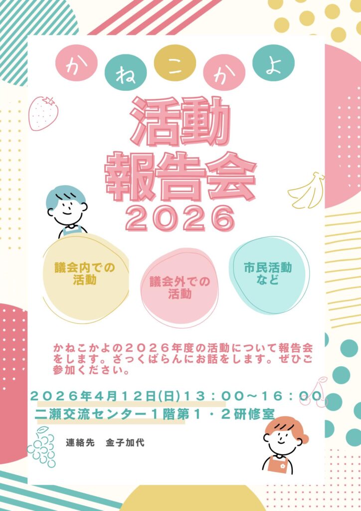 2026年4月7日 / 最終更新日 : 2026年4月7日 金子 加代 議会報告会 【かねこかよ活動報告会2026のお知らせ】【かねこかよ活動報告会2026のお知らせ】かねこかよの活動を知ってもらいたく、4/12(日)13:00〜16:00二瀬交流センターで行います。お時間のある方はぜひご参加くださいFacebookXBlueskyHatenaCopy