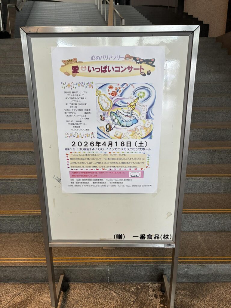 2026年4月18日 / 最終更新日 : 2026年4月19日 金子 加代 飯塚市のこと 【4/18 愛いっぱいコンサート]【4/18 愛いっぱいコンサート]毎年楽しみにしているトゥインクルキャッツのコンサート。今年は23回目で、1回目からほぼ欠かさず観に来てます。合奏、ピアノ演奏、ミュージカルの3プロフィール構成で、あっという間の2時間でした。セリフを忘れても、ステージのメンバーも会場もみんなで待つ空気が、本当に心地よいなあと思います。飯塚の誇りだと私は思ってます。来年も楽しみです。FacebookXBlueskyHatenaCopy