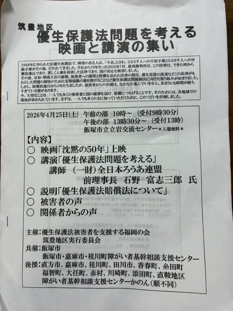 2026年4月25日 / 最終更新日 : 2026年4月26日 金子 加代 研修会に参加しました 【4/25 講演会・学習会参加】【4/25 講演会・学習会参加】午前中は、立岩交流会センターで行われた「優生保護法問題を考える映画と講演の集い」に参加。 旧優生保護法で、どれだけ多くの人が傷つき、今でも苦しんでいるのかと思うと本当に苦しくなりました。午後は、「大将陣公園横の感染性廃棄物などの産業廃棄物処理事業に関する会議」に参加。桂川の問題ではなく、飯塚の問題として考えなくてはいけない問題です!FacebookXBlueskyHatenaCopy